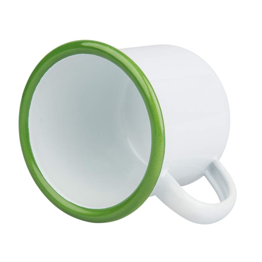 White enamel metal sublimation mug with a colorful rim, designed for custom printing and personalized gifts.