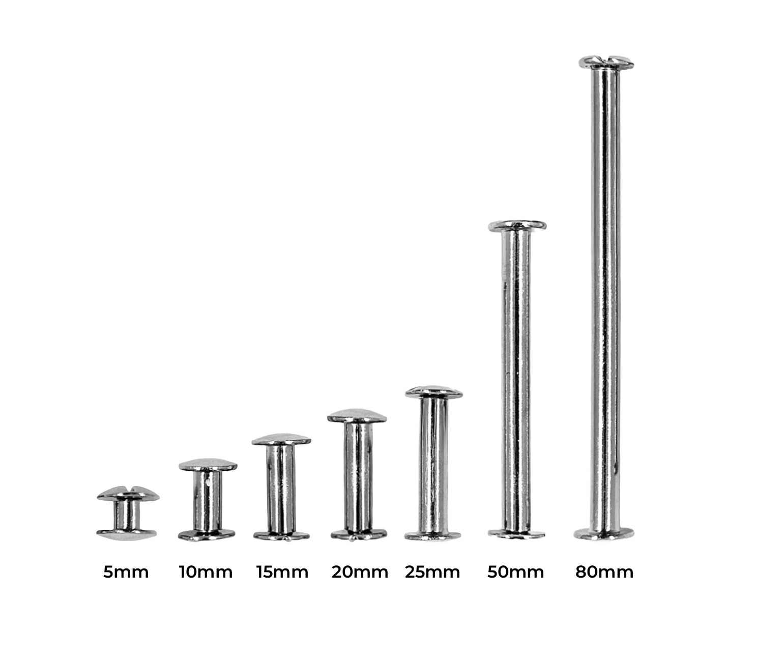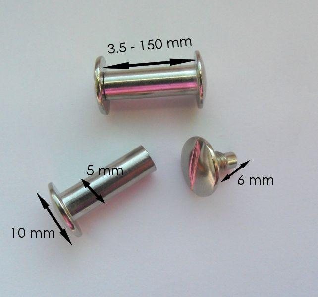 All metal binding screws have a thread diameter of 5 mm and a head diameter of 10 mm, and they differ in the length of the threaded section.