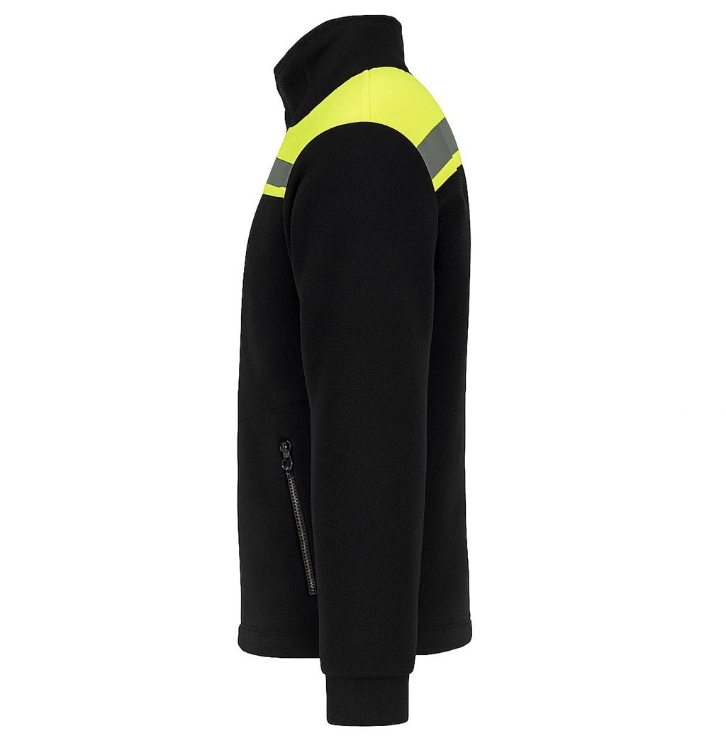 The black full-zip fleece jacket with reflective inserts offers an excellent combination of warmth and safety. Key features include reflective strips and neon fabric panels sewn onto the shoulders for enhanced visibility. This high-visibility jacket is ideal for roadwork, warehouse operations, construction sites, and transport services. It also ensures better visibility during forest walks or mountain trips.