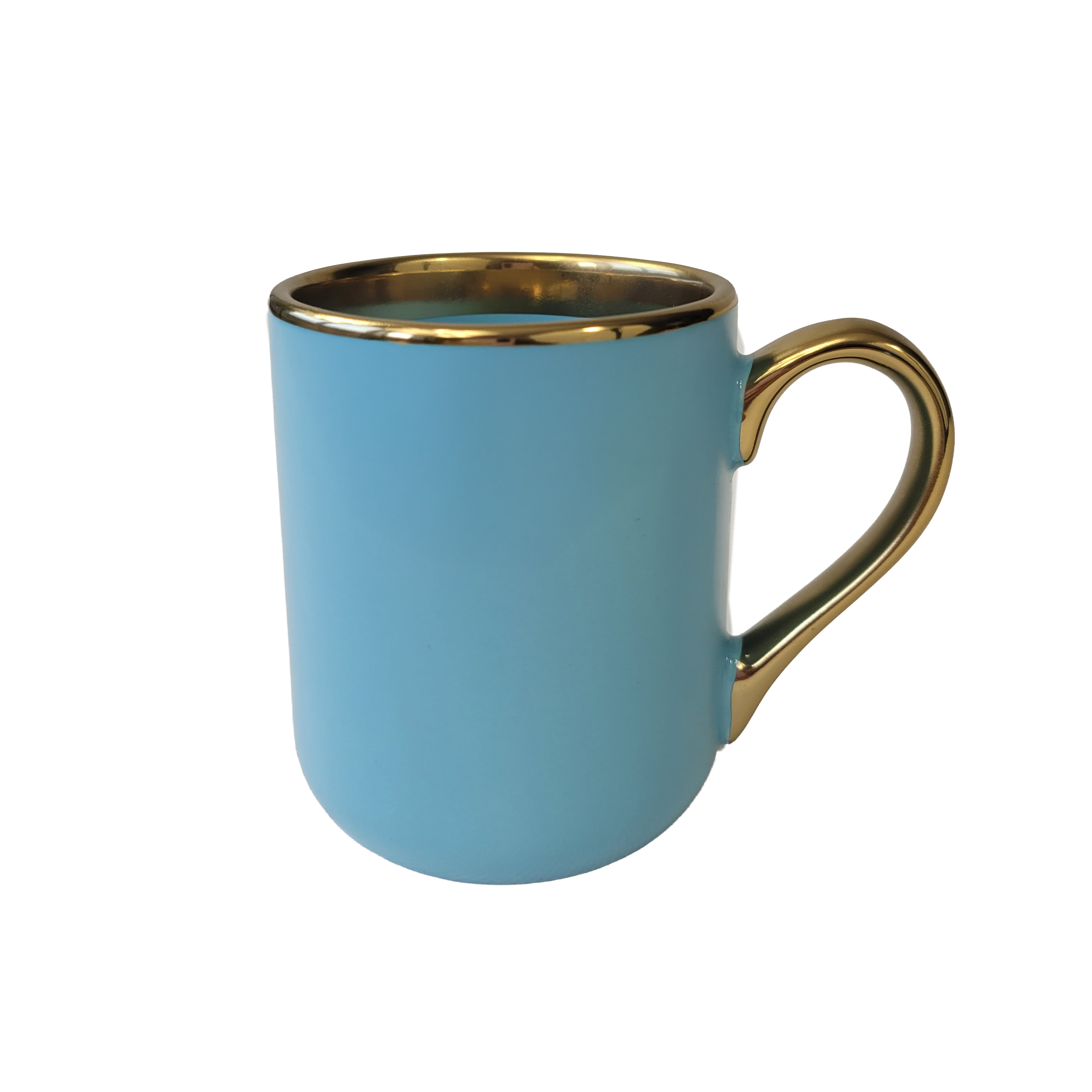 • An elegant mug with a gold handle and rim features a slim shape that fits perfectly in the hand — ideal as a promotional item for any company or a personalized gift.