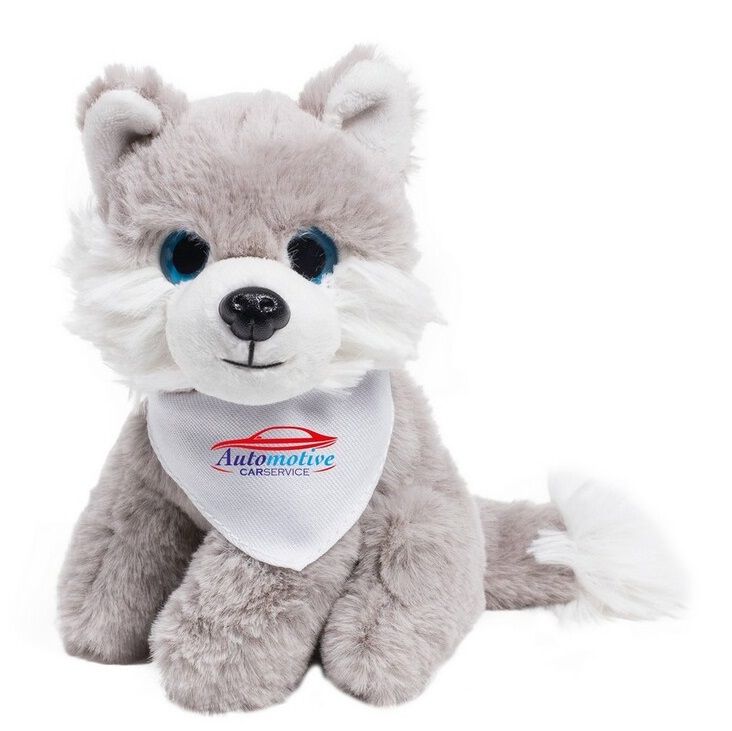 Mascot - a plush wolf with a white scarf for sublimation, mascot height: 14 cm, scarf dimensions: 5 x 2 cm.